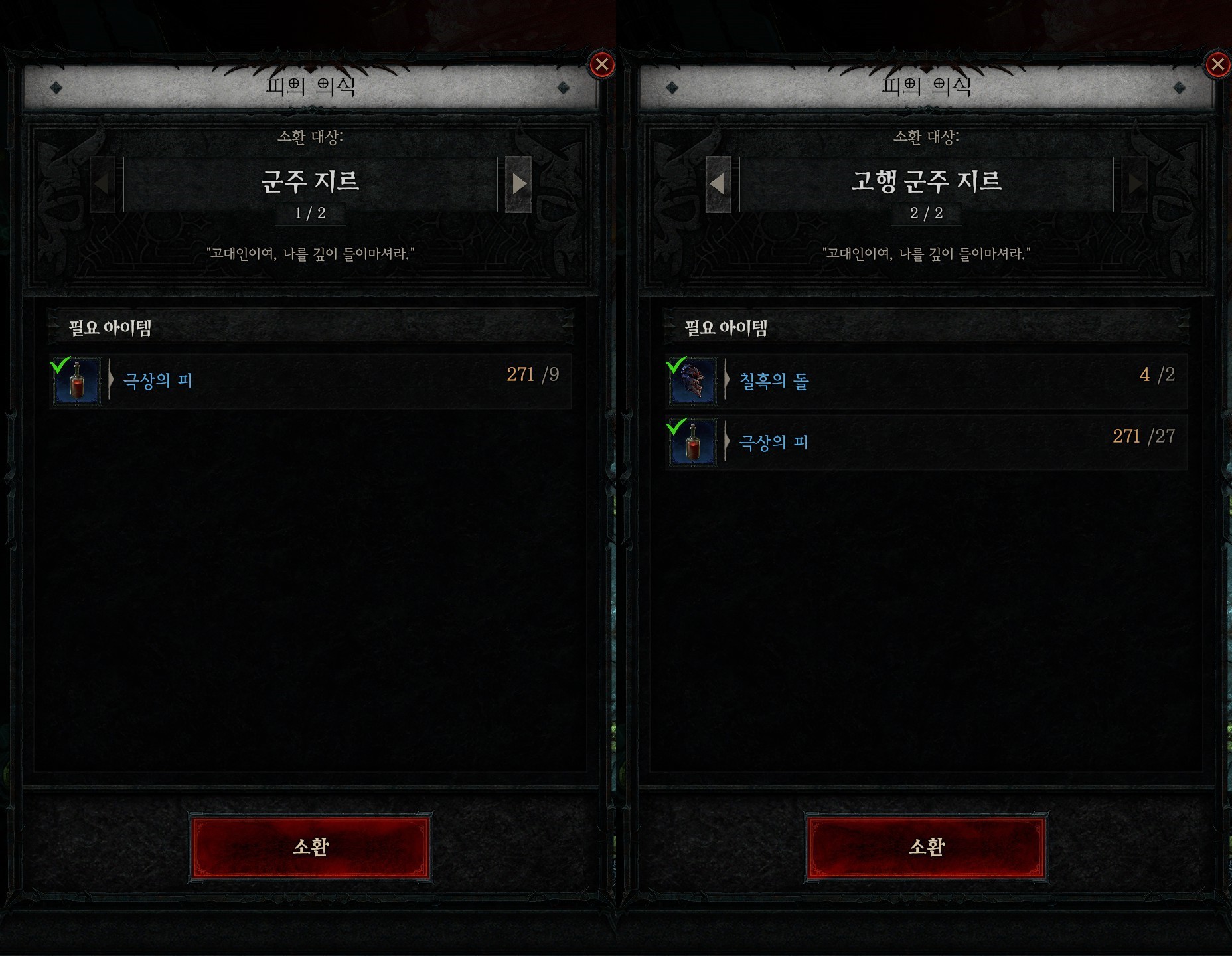 그리고 우버 몬스터를 소환하는 데는 극상의 피 27개와 칠흑의 돌 2개가 소모됩니다.
