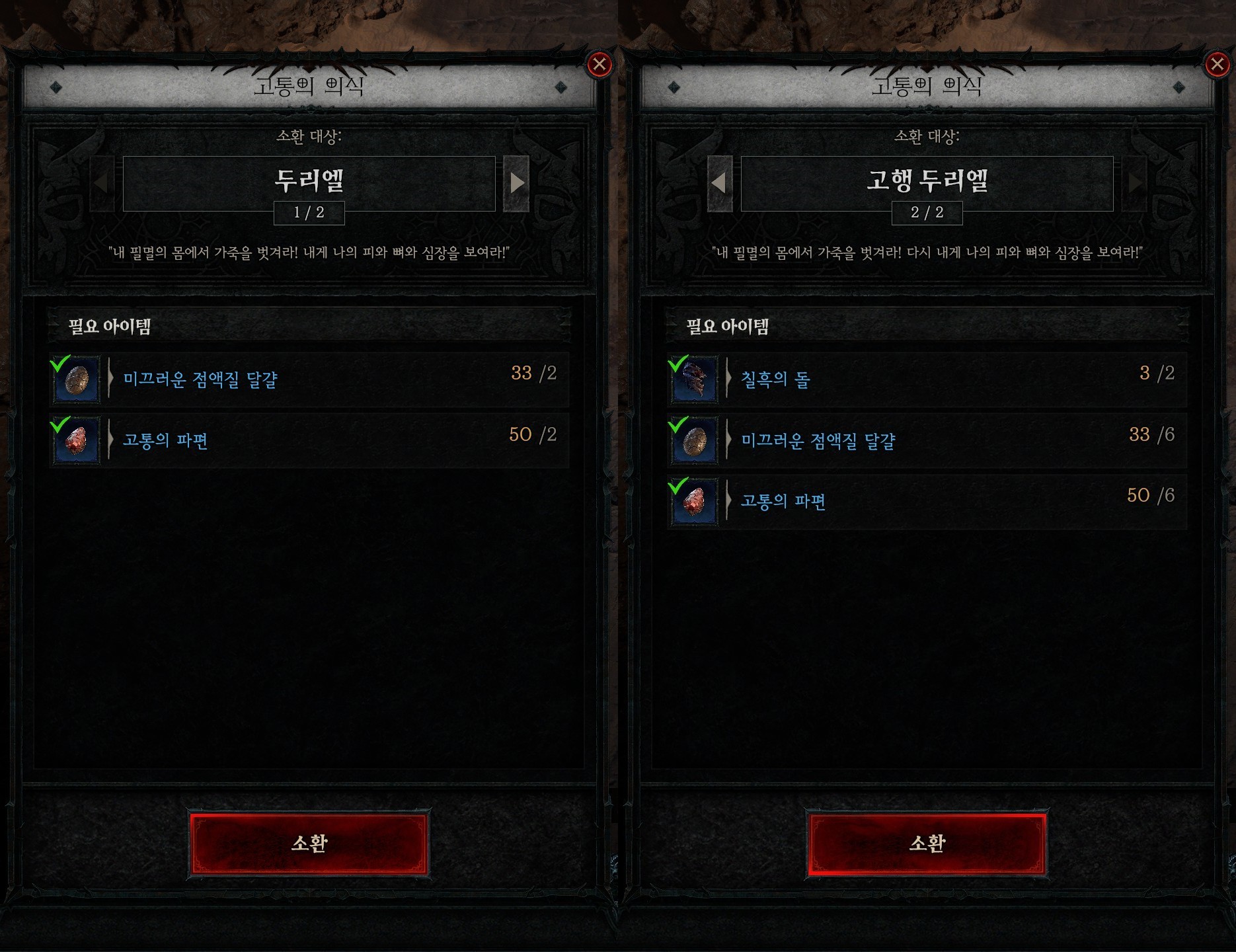 고행 소환은 칠흑의 돌 2개와 미끄러운 점액질 달걀과 고통의 파편이 각각 6개씩 소모됩니다.
