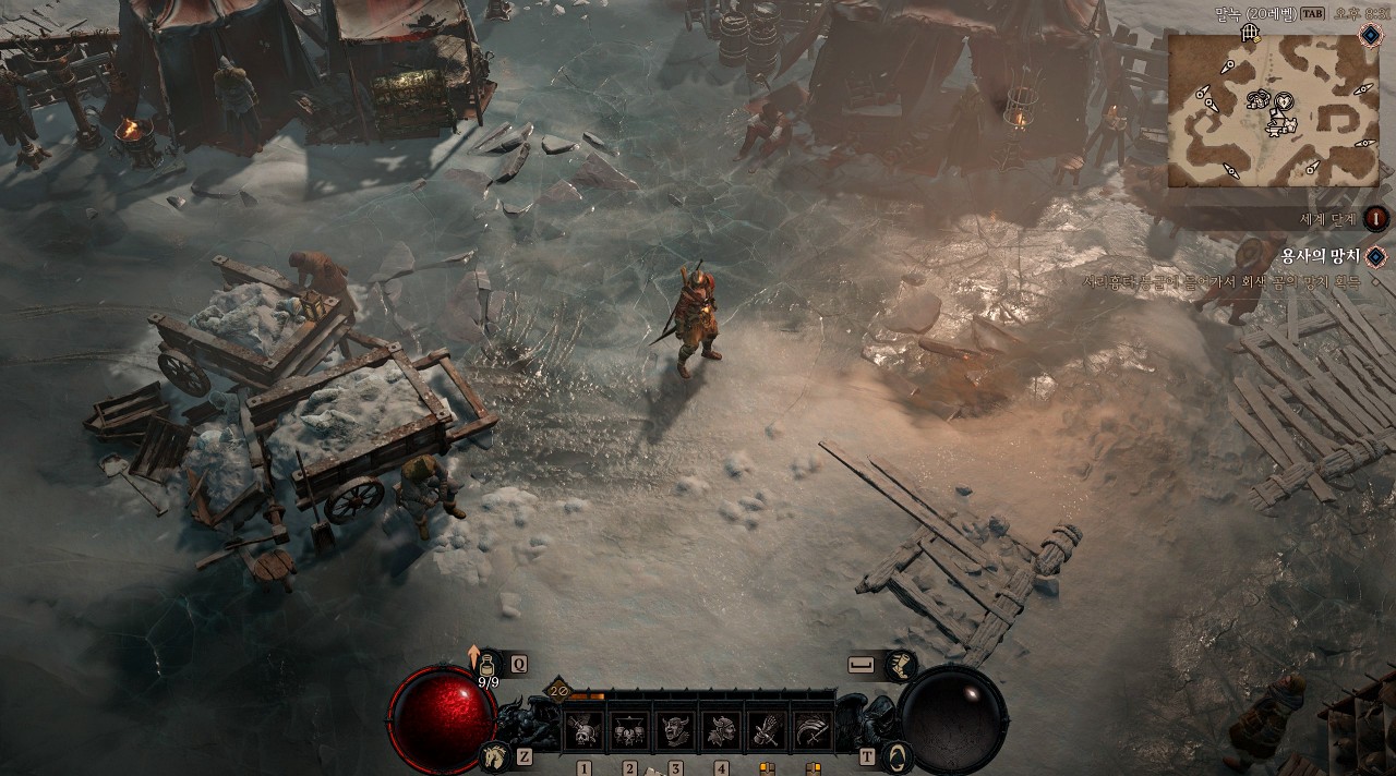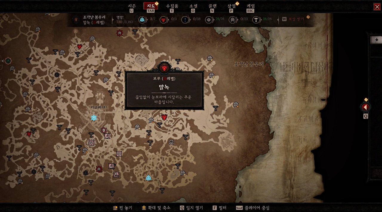 맵을 열고 보루 말녹 아이콘에 마우스를 올려 보면 '끊임없이 눈보라에 시달리는 추운 마을입니다.'라고 적혀 있습니다. 이 설명에서 예상할 수 있듯이 이 마을은 모든 것이 얼어붙었습니다.