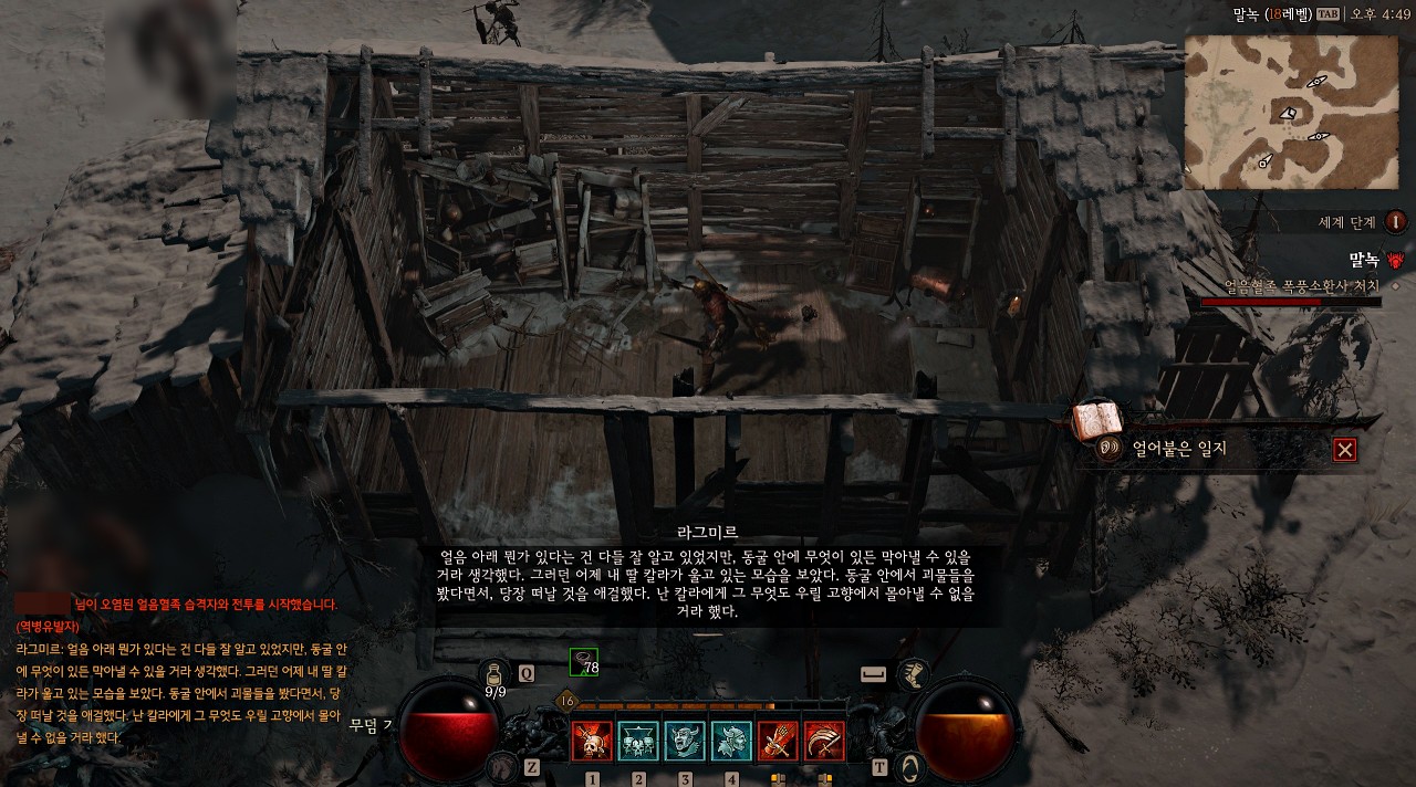 폭풍소환사들을 처치하면서 퀘스트를 진행하다 보면 얼음으로 입구가 막혀있는 집이 하나 있는데 그 안에서 라그미르라는 사냥꾼의 일지인 '얼어붙은 일지'를 얻을 수 있고 마을에 무슨 일이 일어난 것인지 알 수 있습니다.