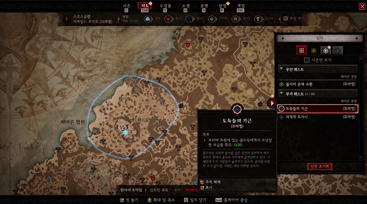 지도를 열어보면 코타마 초원이 있는 좀도둑에게서 도난당한 보급품을 20개 획득하는 미션 탭과 함께 탐색 지역이 표시되어 있습니다. 물건을 강탈한 특정 도둑을 잡는 퀘스트는 아닌 것을 알 수 있습니다.