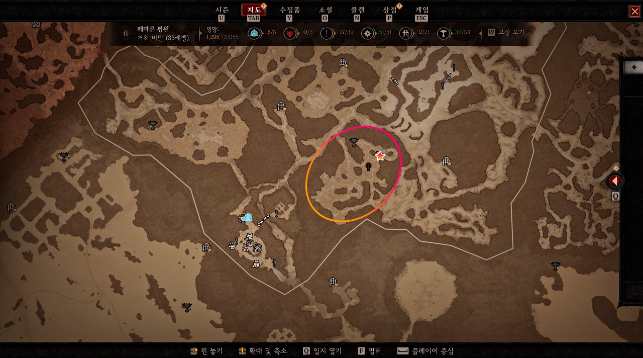 제가 획득한 정확한 위치는 별표시되어 있는 지점이지만 다른 캐릭터로 수행했을 때에는 해당 범위에 있는 다른 오브젝트를 수색하다가 획득하였습니다.