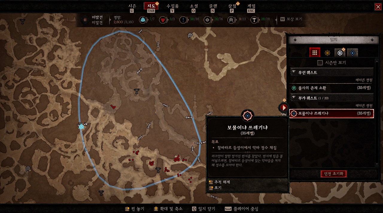 반지를 획득하고 지도를 열어 보면 바로 앞마당에 상당히 큰 하늘색 탐색 범위가 그려져 있는데 그 안에서 악마들을 처치하고 정수를 수집하면 되는 간단한 퀘스트입니다.