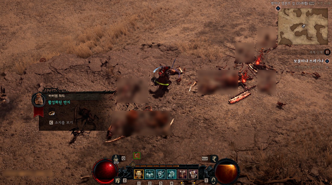 악마들을 잡으면 빨간색 정수들이 드롭되는데 해당 정수를 획득하면 게이지가 차게 되고 전부 채우면 '활성화된 반지' 퀘스트 아이템을 획득할 수 있습니다.