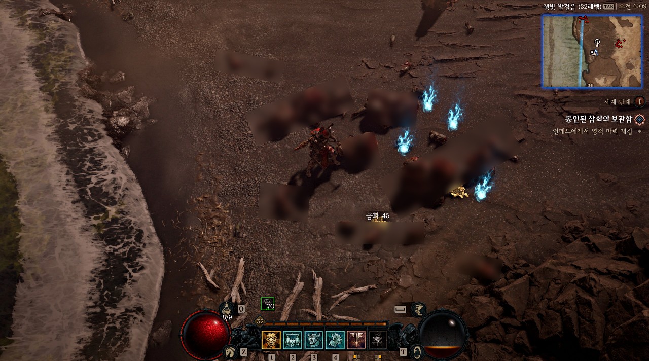 지도에 표시된 빨간 점 표시를 찾아 좀비들을 해치우면 위 사진 처럼 하늘색 구슬들이 드롭되고 구슬들을 모으면 마력 채집 게이지가 올라갑니다. 몇 개 안 먹어도 게이지가 전부 차기 때문에 오래 사냥을 할 필요 없는 퀘스트입니다.