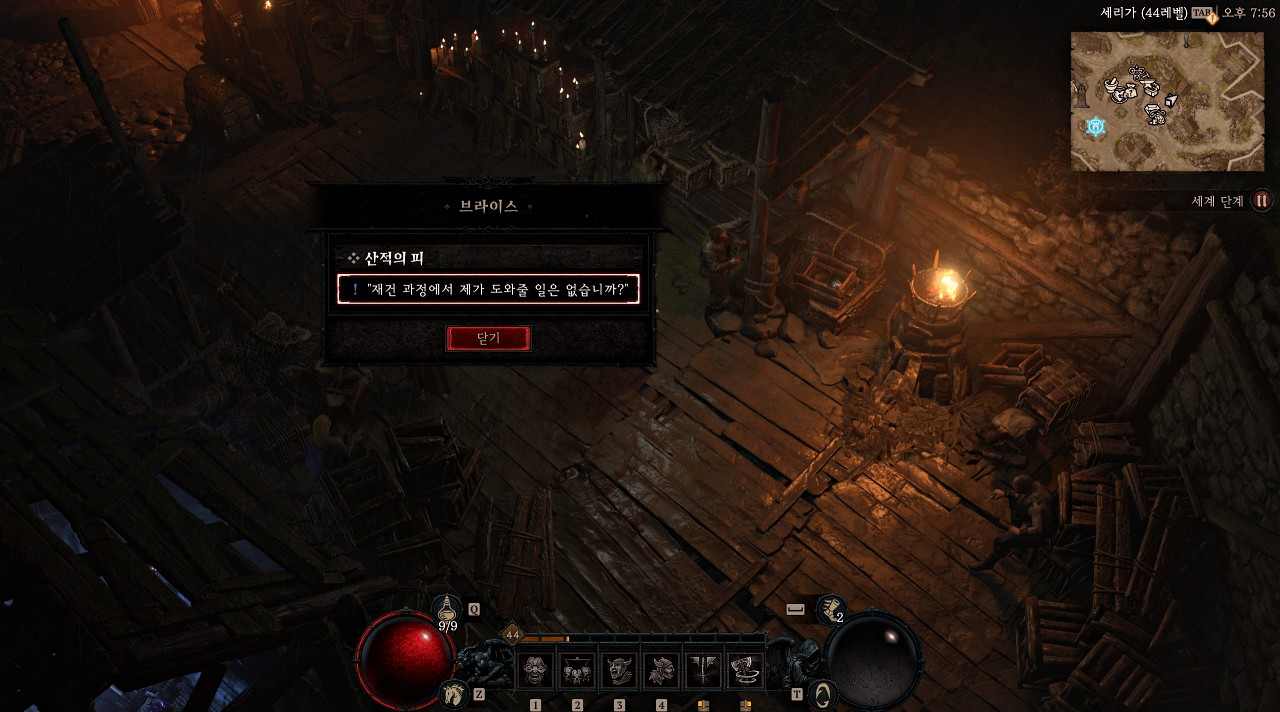 세리가는 악마의 공격으로부터 재건 중인 마을이고 브라이스는 보석상 바로 위에 있는 집 기둥을 망치로 고치고 있습니다.