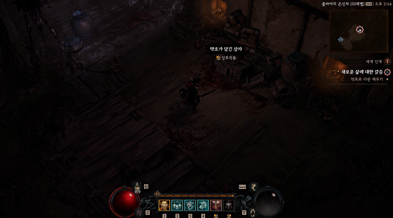 은신처로 진입해서 가장 안쪽으로 들어가 보면 상호작용을 할 수 있는 약초가 담긴 상자가 있습니다. 해당 오브젝트를 클릭하면 플라스크가 채워지고 식인종 일반 몬스터 한 무리가 스폰됩니다. 몬스터는 처치하지 않고 나가도 크게 상관없습니다.