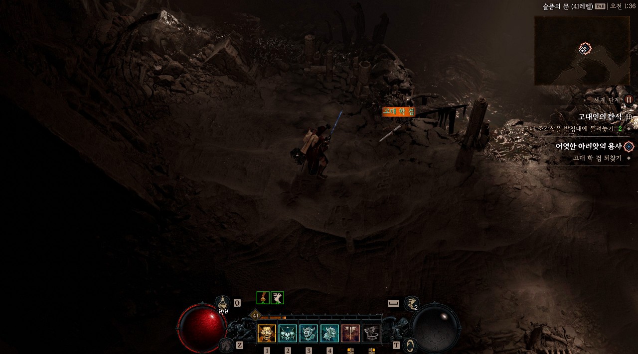 선조의 해골에 검이 꽂혀 있는데 오브젝트를 클릭하면 퀘스트 아이템인 고대 학 검이 드롭됩니다.