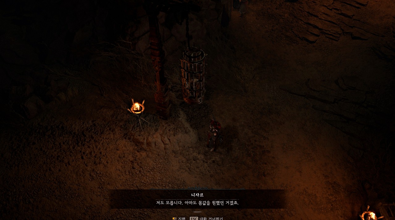 흑마노 감시탑을 정복하다 보면 포로 한 명이 새장 같은 우리에 갇혀서 플레이어가 좀도둑 소굴을 소탕하는 것을 보면서 응원하고 있습니다.