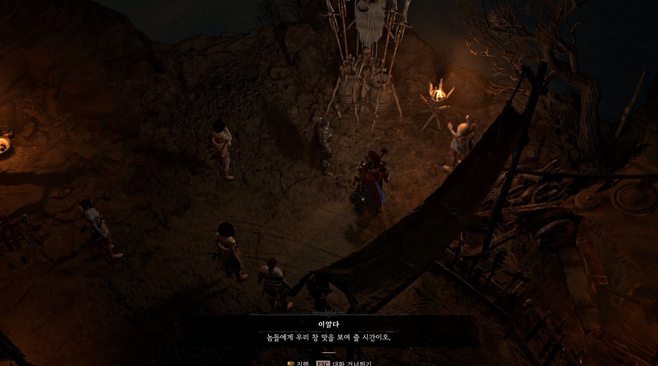 해당 장소로 이동해 보면 이알다가 부족 사람들을 모아 놓고 수거해 온 창을 보여주며 이제 놈들에게 창 맛을 보여 줄 때가 되었고 선조들의 희생을 헛되이 해서는 안된다며 연설을 하고 있습니다.