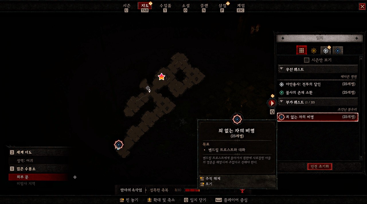 퀘스트를 읽어 보면 '검은 수용소 환자의 고통받는 영혼이 길동무를 찾으려 한다.'라고 적혀 있는데 이 것만 읽어서는 퀘스트 내용을 정확하게 알지 못하도록 상당히 돌려서 작성해 놓은 설명입니다.