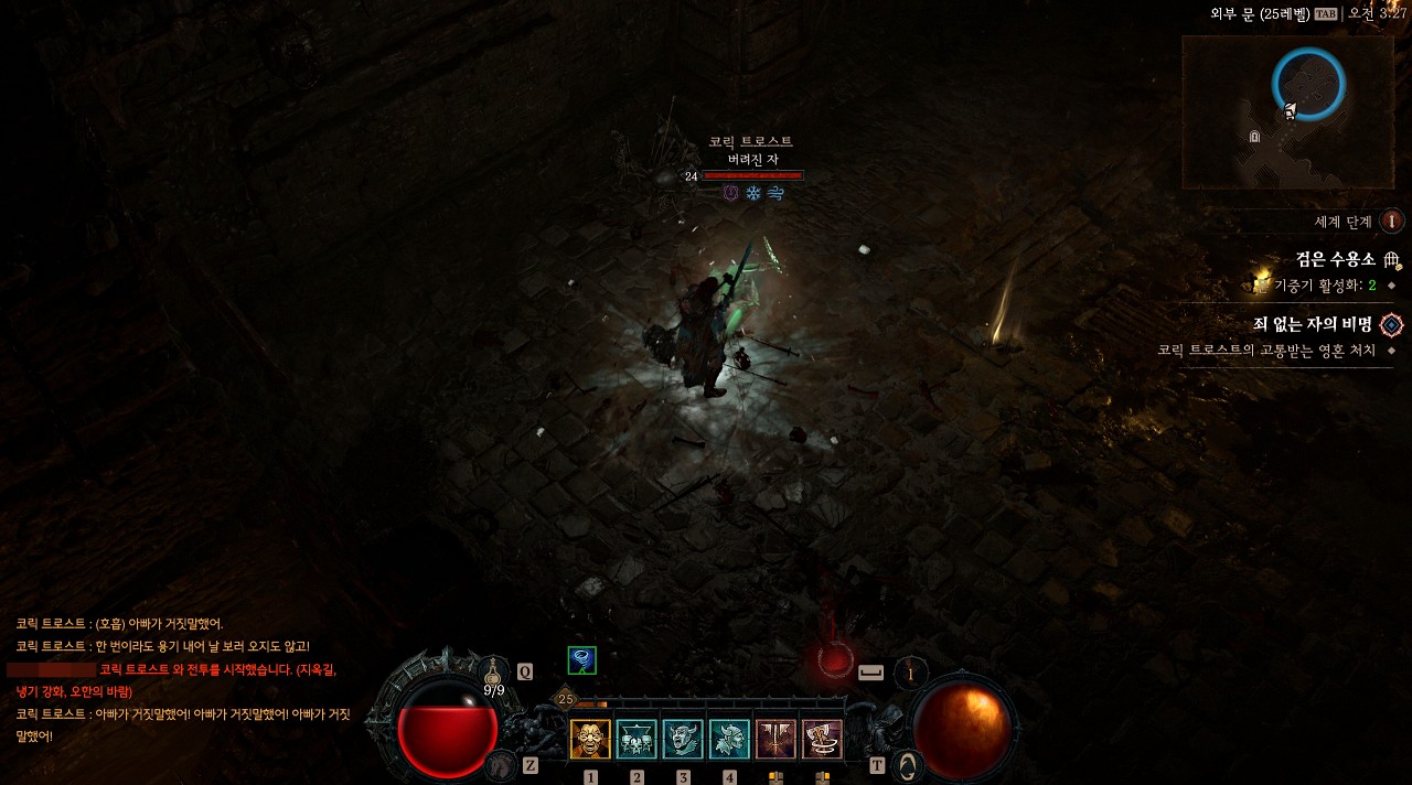 해당 장소로 이동하면 코릭 트로스트가 나타나는데 지옥길, 냉기 강화, 오한의 바람 특성을 지닌 일반 정예 몬스터입니다.