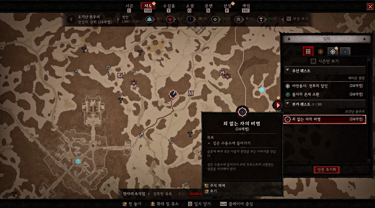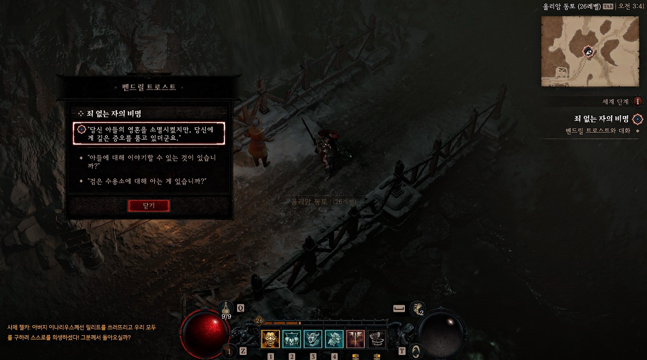 이번 퀘스트는 조각난 봉우리 키요바샤드 동쪽 문으로 나가면 도시 밖에서 만날 수 있는 NPC 벤드릴 트로스트에게서 시작할 수 있는 '죄 없는 자의 비명'입니다.