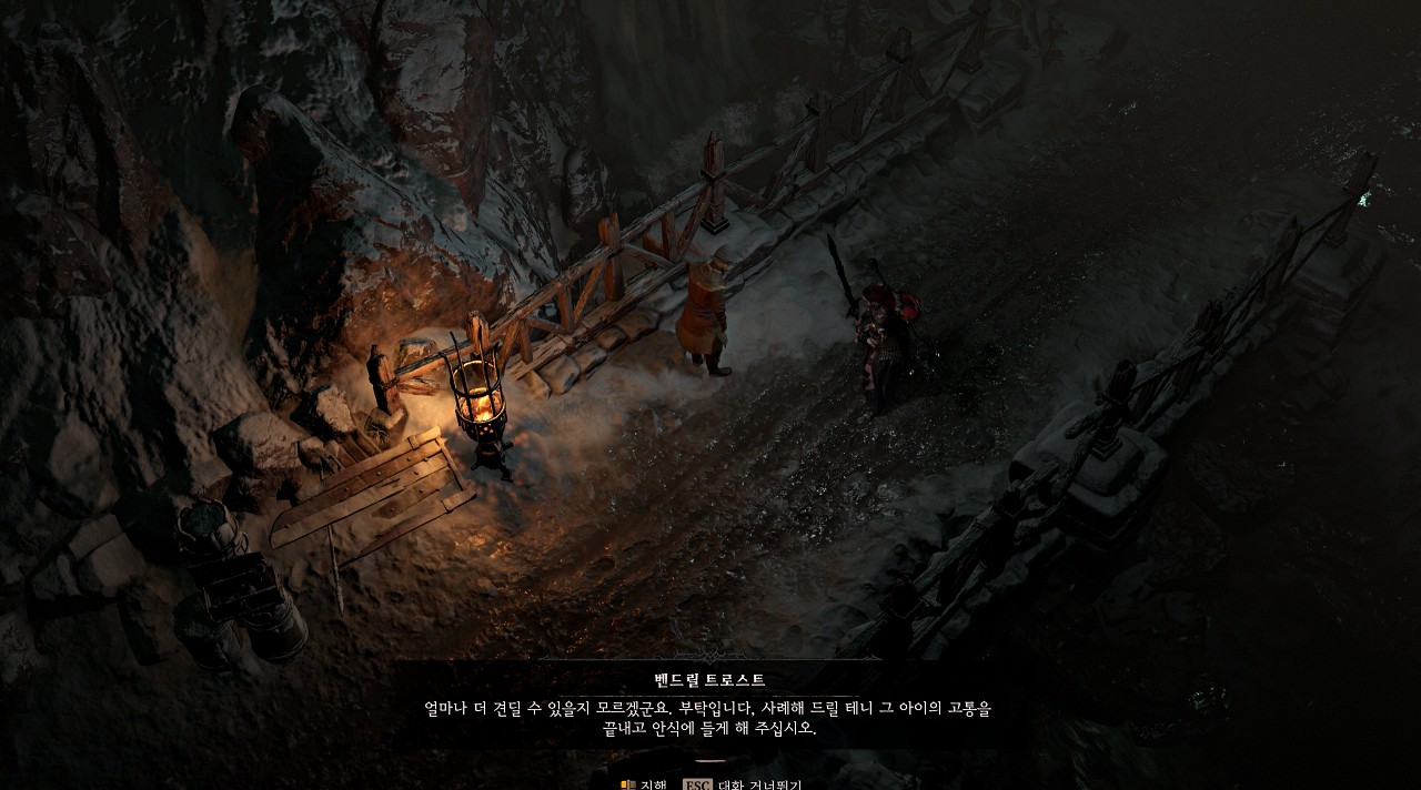 처리하는 동안 이야기하는 대사를 들어보면 아빠가 거짓말을 했고 한 번도 자신을 보러 오지 않았다며 원망하고 있는 것을 알 수 있습니다. 간단히 처리하고 온 김에 검은 수용소도 클리어를 해 주고 벤드릴 트로스트에게 돌아가 봅시다.