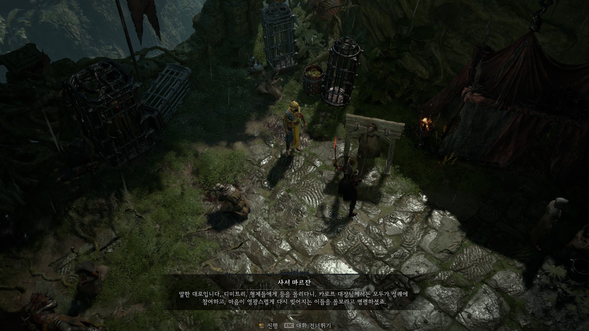 해당 위치로 달려가 보면 아주 작은 규모의 야영지가 있고 사제 디미트리가 칼이 채워진 채 결박되어 있습니다.