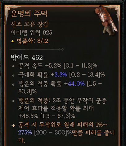 핵심 아이템은 행운 적중 확률이 30% 이상, 피해량은 200% 이상 붙은 운명의 주먹입니다.