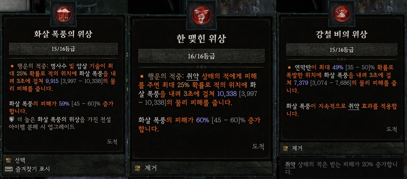 툴팁을 보시면 아시겠지만 화살 폭풍 피해 증가 옵션이 이 두가지 위상에만 붙어 있어요.