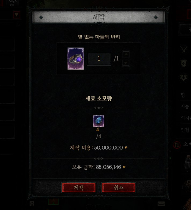 그래서 최초로 부 캐릭터 육성을 해볼까 해서 핵심 아이템인 별 없는 하늘의 반지를 만들었습니다.