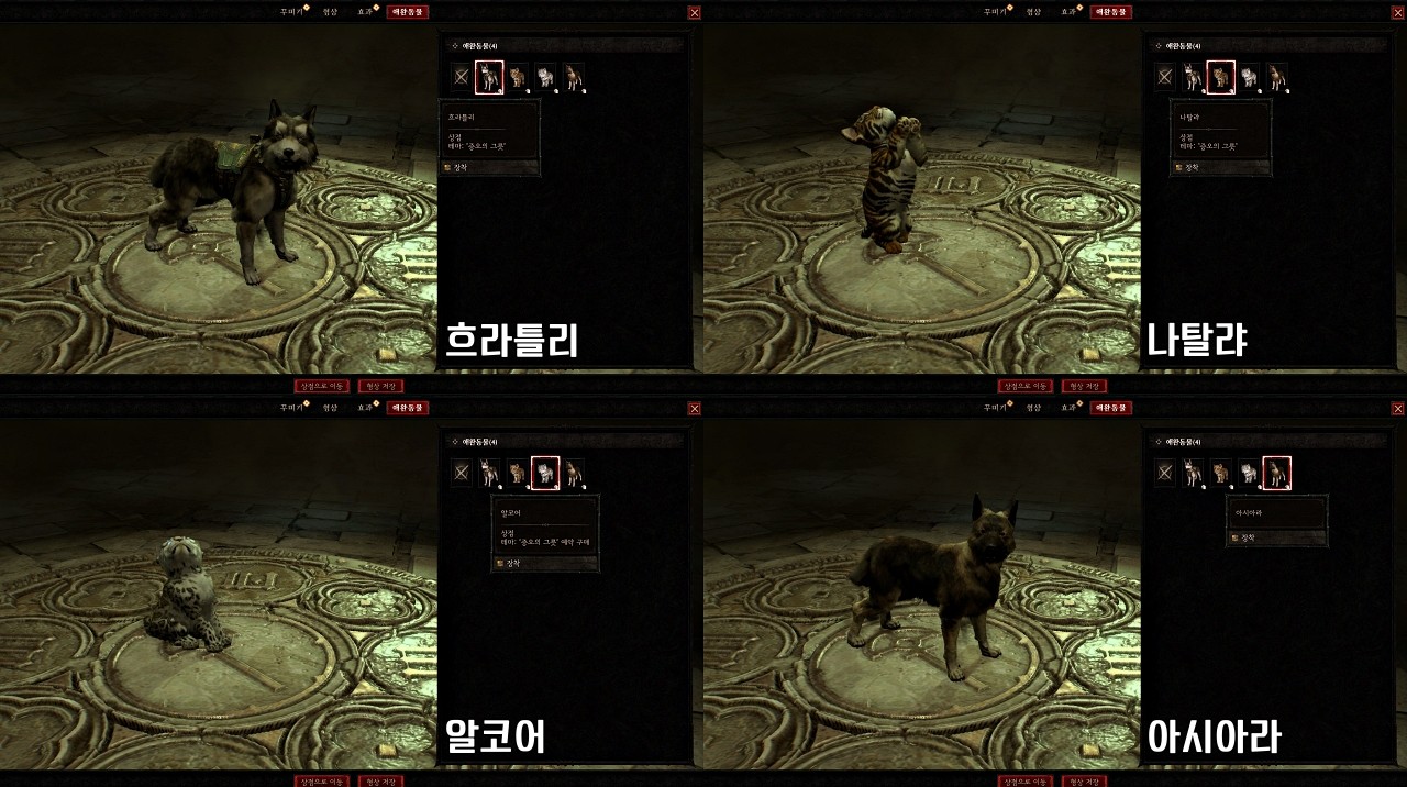 현재 얻을 수 있는 애완동물은 위 사진에서 볼 수 있는 총 4 종류입니다.