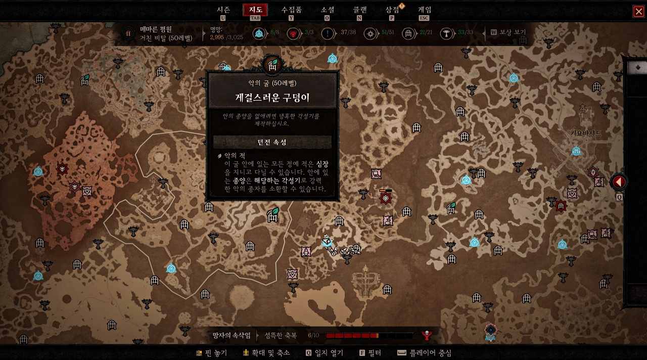 이제 메마른 평원에 있는 콰라이수 폐허로 이동을 해서 좌측에 있는 '게걸스러운 구덩이'라는 시즌 던전으로 들어가서 해당 던전을 전부 클리어해 줍니다.