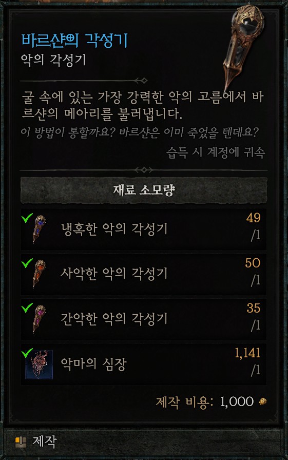 고통받는 바르샨의 각성기는 지옥물결 돌아야 얻을 수 있는 마귀 장미와 잊힌 영혼이 재료로 들어갑니다. 이제 최종 난이도이기 때문에 필요하신 만큼 제작을 해 주시면 될 것 같습니다.