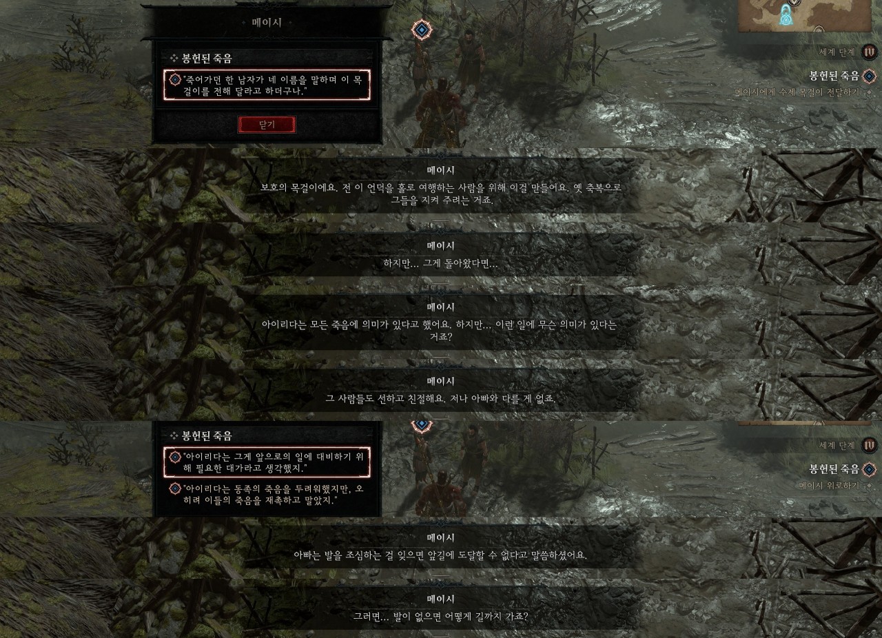 메이시에게 돌아가서 사냥꾼의 이야기를 전하면 목걸이를 자신이 만들어 줬다는 이야기와 함께 죽음 앞에 상당히 시니컬해져 있는 것을 알 수 있습니다.