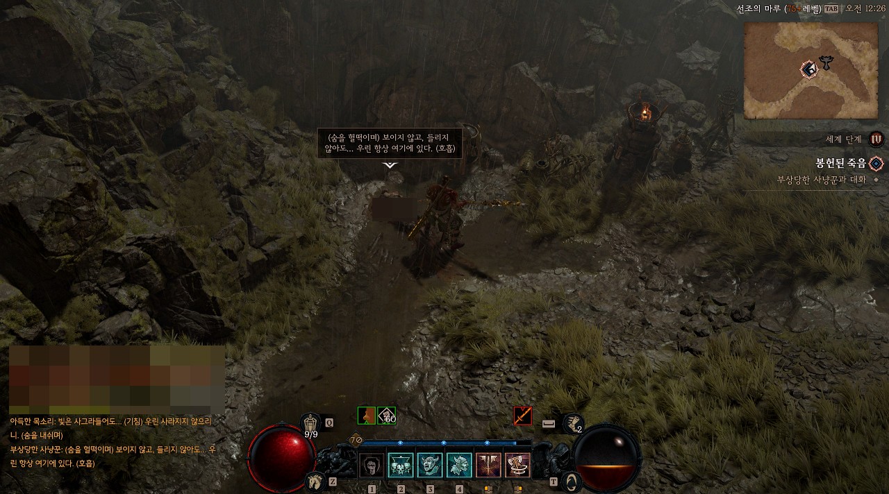 위에 미니맵에 보이는 릴리트의 제단 왼쪽 움푹 파인 곳에서 부상당한 사냥꾼을 찾을 수 있고 목소리가 나는 곳입니다.