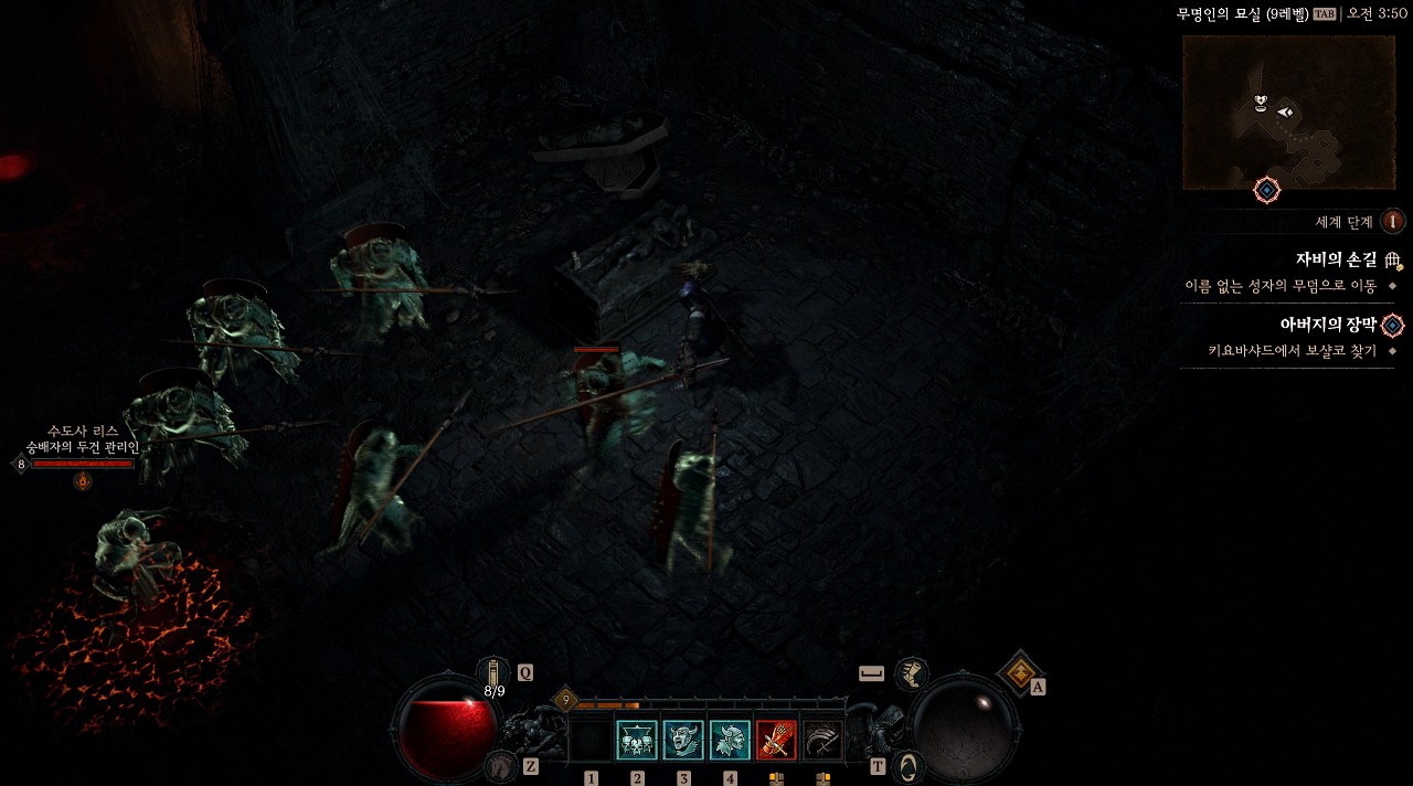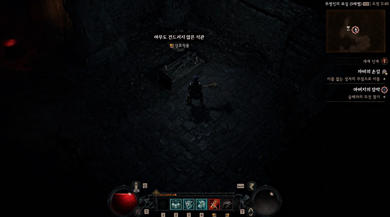 자비의 손길 던전은 서브 목표 두 개를 클리어하고 마지막에 보스를 잡는 구조의 던전인데 두 번째 서브 목표가 진행되는 구간에서 보스방 우측에서 '아무도 건드리지 않은 석관'을 찾을 수 있었습니다. (던전 지도가 랜덤일 경우 위치가 약간 다를 수 있습니다.)
