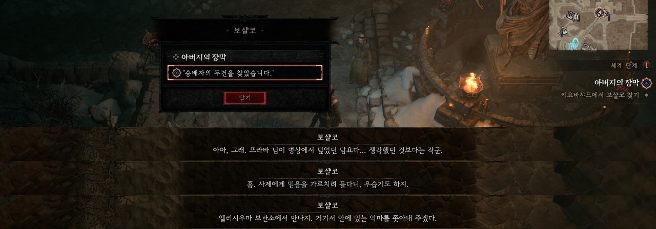 보샬코는 플레이어가 환영을 보는 것이 악마가 씌어서 그렇다며 몰아내려면 퇴마의식을 해야 한다고 합니다. 자신이 퇴마 의식을 도와줄 수 있는데 이나리우스의 손길이 닿은 성물이 필요하다며 자비의 손길(인스턴트 던전)로 가서 숭배자의 두건이라는 성물을 가져와 달라고 이야기합니다.