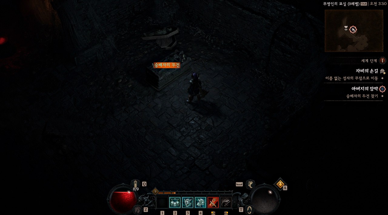 자비의 손길 던전은 서브 목표 두 개를 클리어하고 마지막에 보스를 잡는 구조의 던전인데 두 번째 서브 목표가 진행되는 구간에서 보스방 우측에서 '아무도 건드리지 않은 석관'을 찾을 수 있었습니다. (던전 지도가 랜덤일 경우 위치가 약간 다를 수 있습니다.)