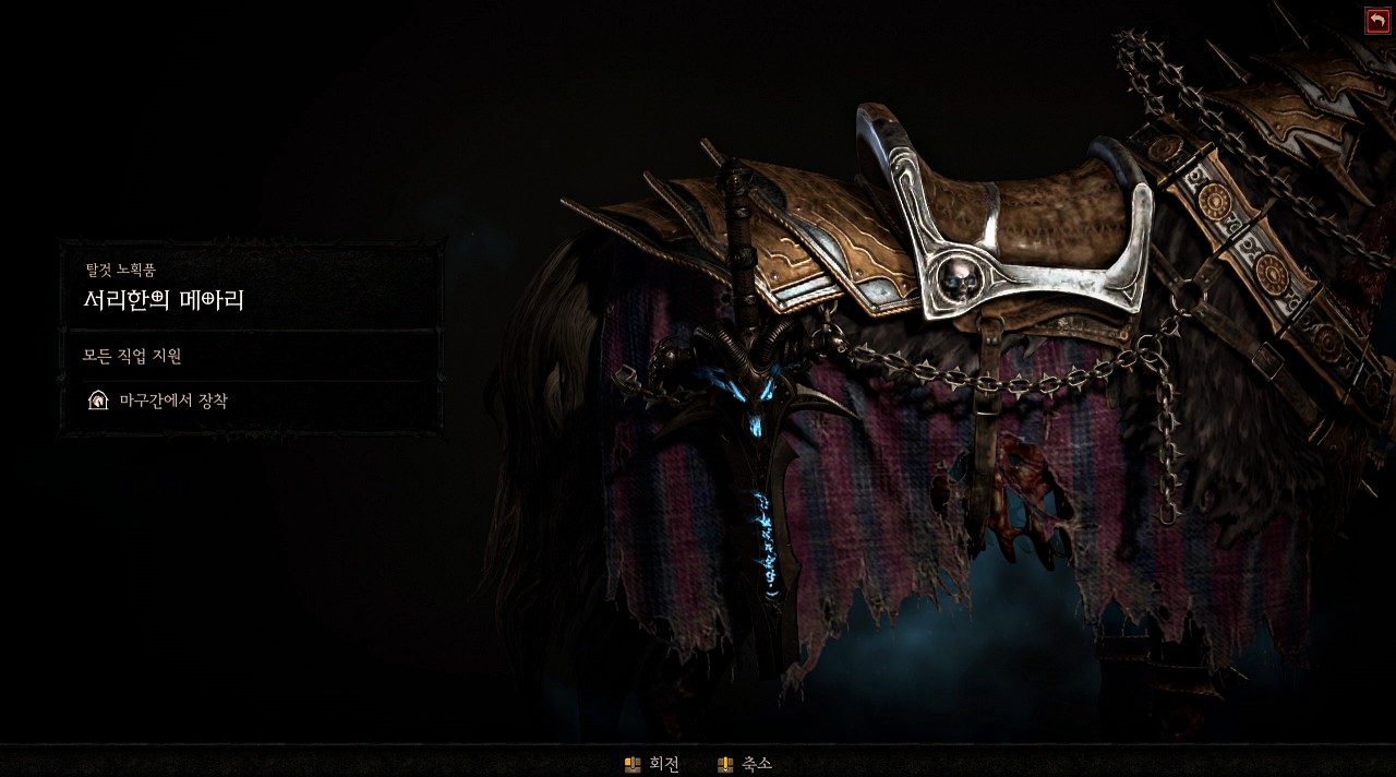그리고 말을 치장할 수 있는 노획품을 두개 줍니다. 그중에서 첫 번째는 부러진 서리한의 모양을 하고 있는 '서리한의 메아리' 입니다. 사실 이거 보고 구매 하는 거죠.