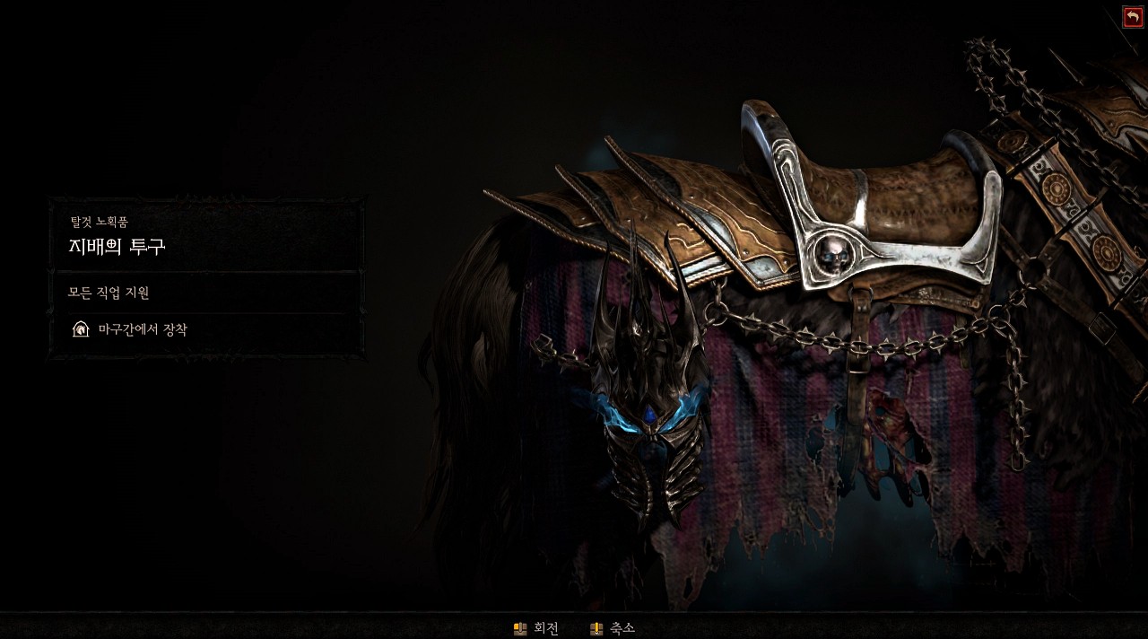 그리고 두번째 노획품은 넬쥴이 빙의되어 있는 아서스의 투구, '지배의 투구'입니다. 원래는 눈에 불이 꺼져 있다가 아서스가 쓰면 불이 들어오는데 이 투구는 이미 불이 들어와 있습니다. 누구 머리가 안에 있나 확인해 보고 싶네요...