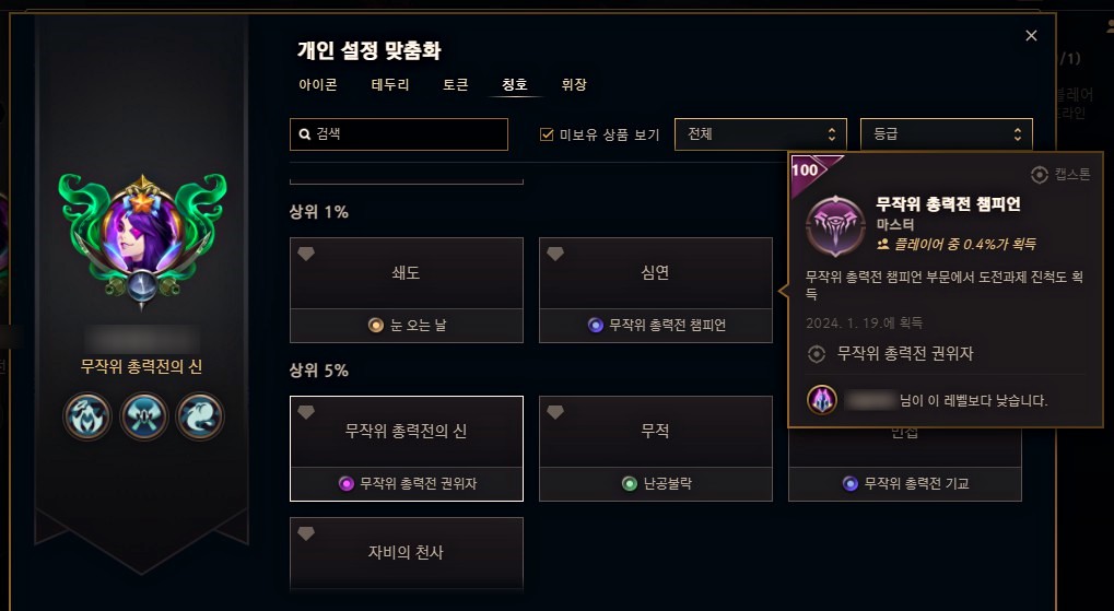 여하튼 이게 뭔가 봤더니 무작위 총력전 챔피언 부분에서 도전과제 진척도를 좀 더 끌어올리면 받는 칭호 같아요.