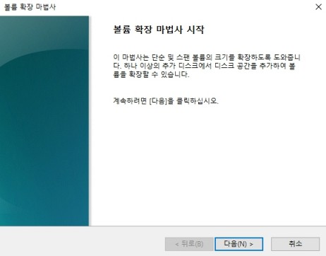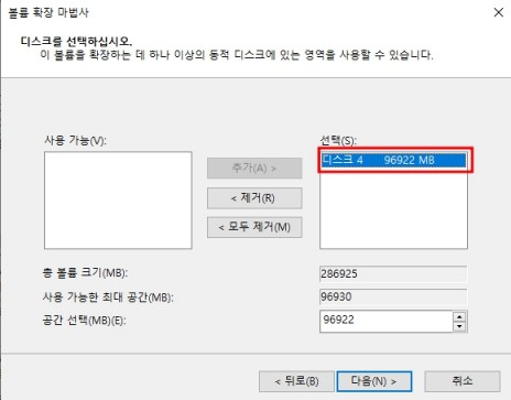 그러면 볼륨 확장 마법사가 실행되는데 다음을 누르면 디스크 선택창이 나온다.