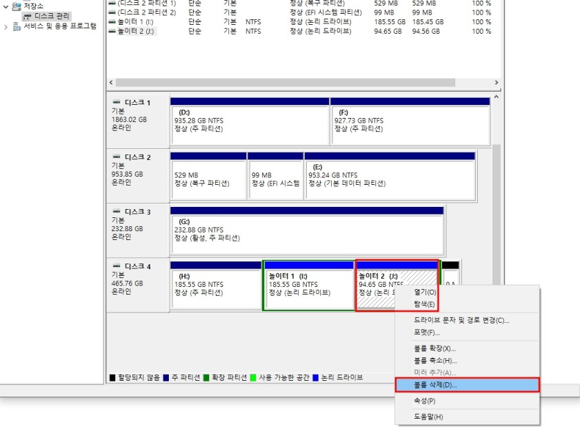 그중에 본인이 합치고 싶은 볼륨을 아무거나 지정한 뒤 우클릭을 하면 메뉴가 팝업 된다.