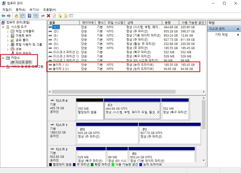 실행시킨 앱의 좌측 탭에서 저장소 - 디스크 관리를 선택하면 가지고 있는 저장장치의 목록들이 나오게 된다.