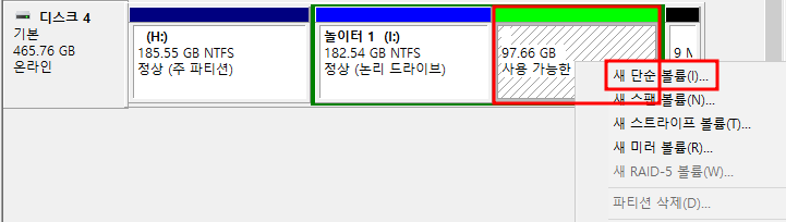 사용 가능한 공간을 우클릭하여 나온 메뉴창에서 새 단순 볼륨을 선택 하자.