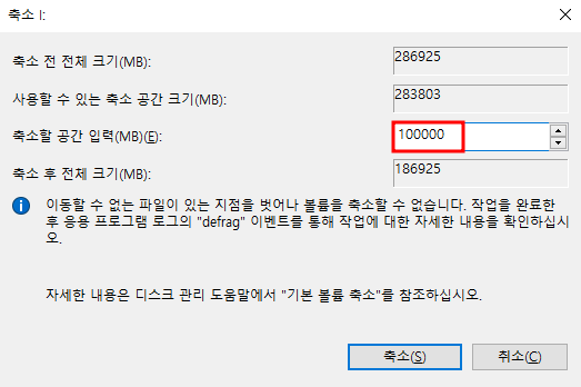 필자는 100GB를 선택했다. 축소를 눌러주자.
