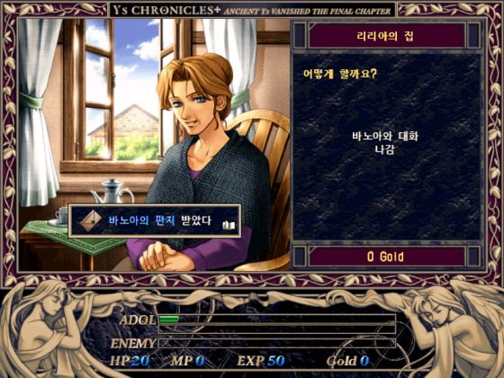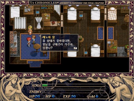 그녀는 이 마을은 이스의 란스라고 하는 마을이고 아돌은 문도리아 폐허라는 곳 근처에 쓰러져 있었는데 그곳은 지금은 마물들이 나타나 폐허가되었지만 원래는 이스의 신관 구역으로 번영했던 장소라고 설명해 준다.
