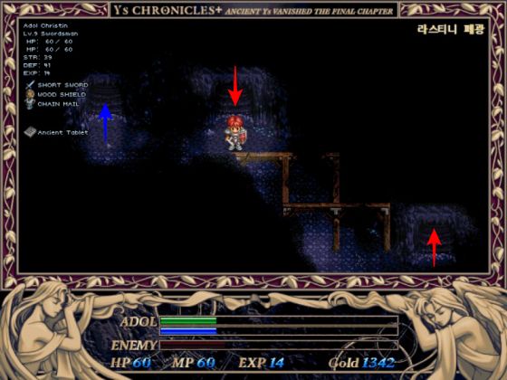 빨간 화살표는 아돌이 폐광안에서 가게 될 진행 방향이고 통로의 모양을 보고 짐작이 가겠지만 돌기둥이 있는 문은 또 다른 성역 토르로 가는 길이다.