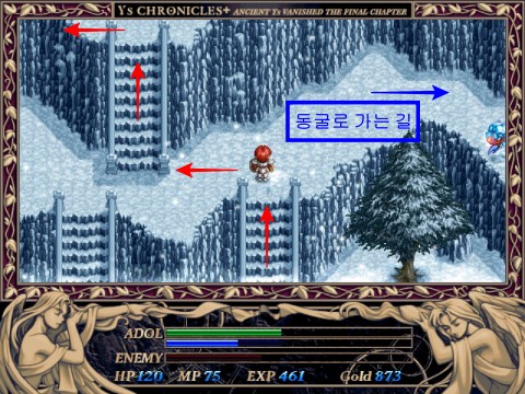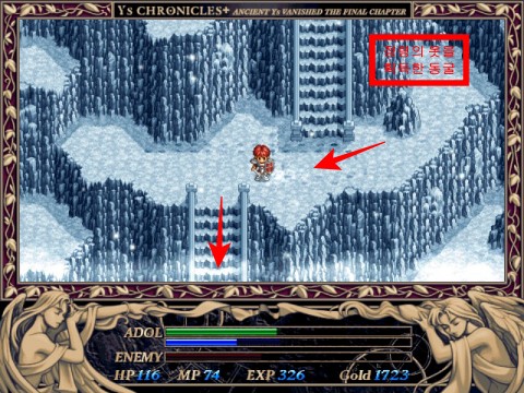 우선 빙무의 구슬 이라는 아이템을 먼저 얻어야 동굴에서 진행이 가능하니 파란색으로 표시된 동굴로 가는 길을 기억 해 두고 빨간 색 화살표를 계속 따라가자.