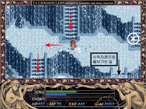 흰색 X 표시된 길은 막혀 있는 길이고 시작 지점으로 돌아가는 길은 동굴로 갈때 편하니까 기억해 두도록 하자.