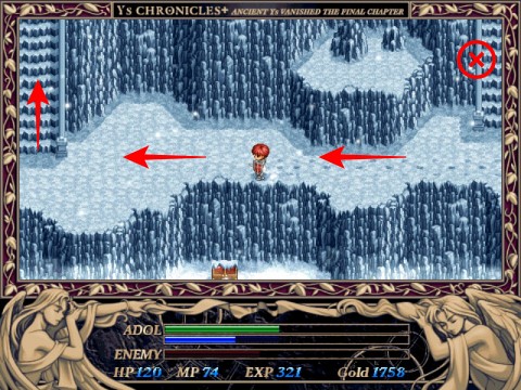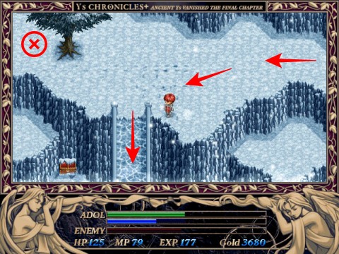 X자로 표시된 길은 막혀 있는 길이고 진행 경로 아래로 보이는 보물상자는 나중에 얻을 수 있으니 우선 진행하자.