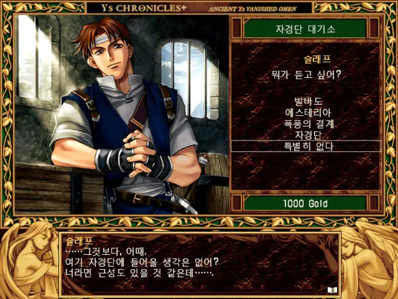 발바도의 주민과 모든 대화를 마치고 슬래프에게 돌아가면 에스테리아 각지를 다녀 보겠다는 것은 너무 무모하다며 혹시 자경단에 들어 올 생각 없냐고 제의 한다.