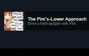 호수에서 획득한 대좌를 미네아 마을 거래소 핌에게 가지고 가면 이 대좌에는 사연이 있었는데 잘 찾아왔다며 2000 골드에 매입을 해 주는데 거래 취소를 계속해서 흥정을 하면 2200 골드를 얻을 수 있고 이렇게 핌과 흥정을 하는 것이 스팀 도전과제 중 하나이다.